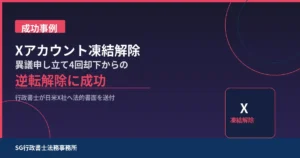 成功事例 【成功事例】X(旧Twitter)アカウント凍結解除|異議申し立て4回却下から行政書士の法的書面送付で約1ヶ月後に凍結解除された実例 目次 はじめに ご相談の背景と凍結の経緯 自力での異議申し […]